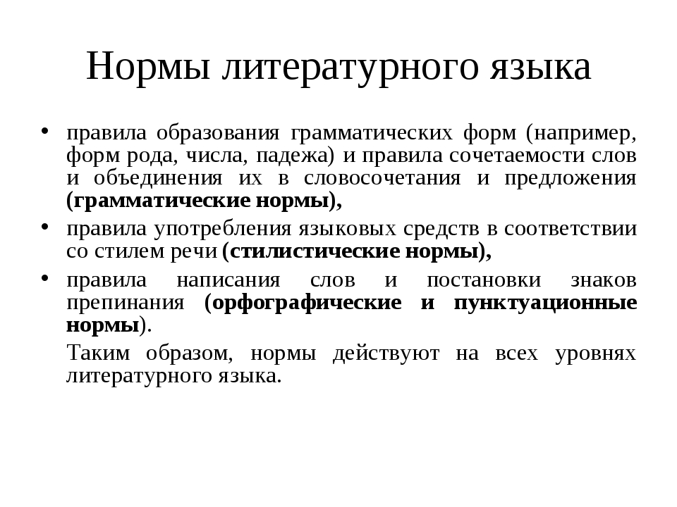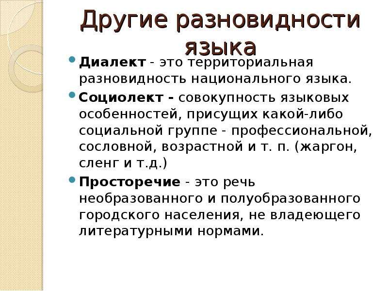 Каждый национальный язык включает литературный язык и территориальные диалекты. Литературным, или «стандартным», называют язык повседневного общения, официально-деловых документов, школьного обучения, письменности, науки, культуры, художественной литературы.