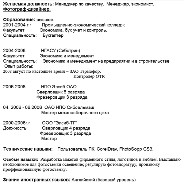 Формат резюме электрика- Сначала укажите свою текущую работу.Продолжайте предыдущие.