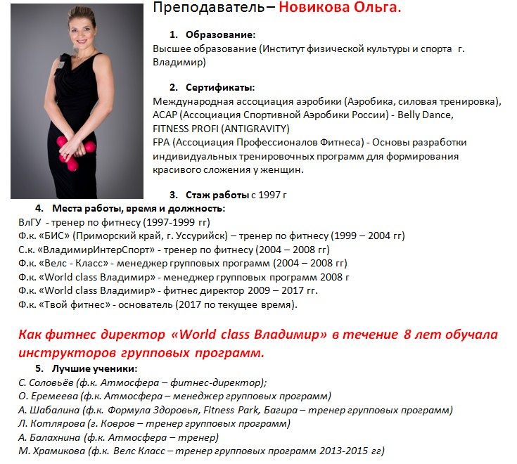 - физическая подготовка; поскольку инструктор должен показывать и выполнять упражнения наравне с клиентами;