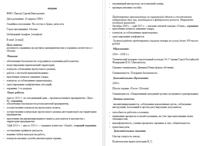 Образец резюме охранника – Готовые примеры (шаблоны)