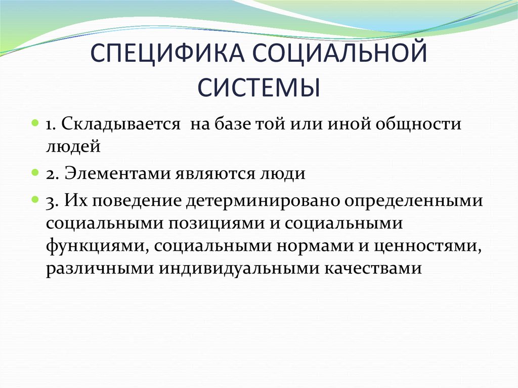 Социальная система представляет собой сеть отношений; под этой темой следует понимать взаимозависимость людей. Самый важный момент, на который следует обратить внимание, заключается в том, что в обществе существует множество социальных систем, каждая из которых придерживается своих правил и норм.