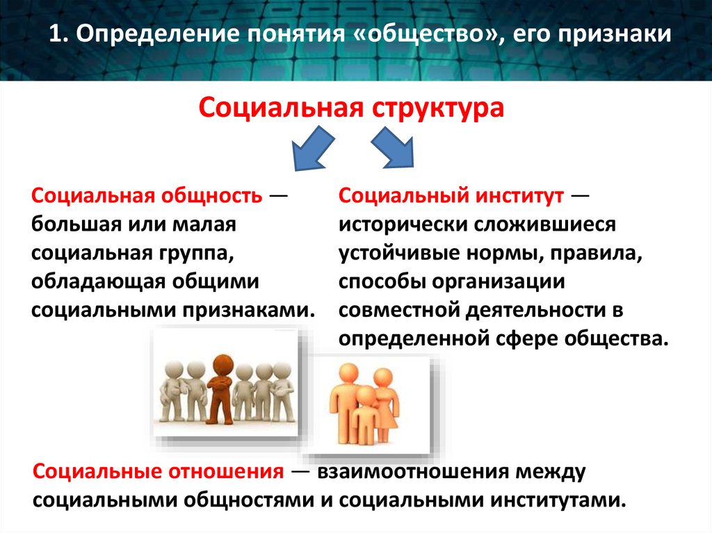 Общество – социальная организация данной страны, основой которой является социальная структура.[4]