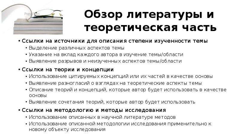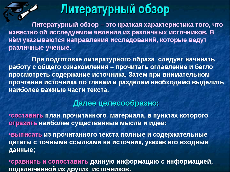 В литературном обзоре дипломной работы важно отметить лишь основополагающие источники информации, акцентировав, почему выбор пал именно на них, где и как представлена та или иная схема, теория, методика и пр.