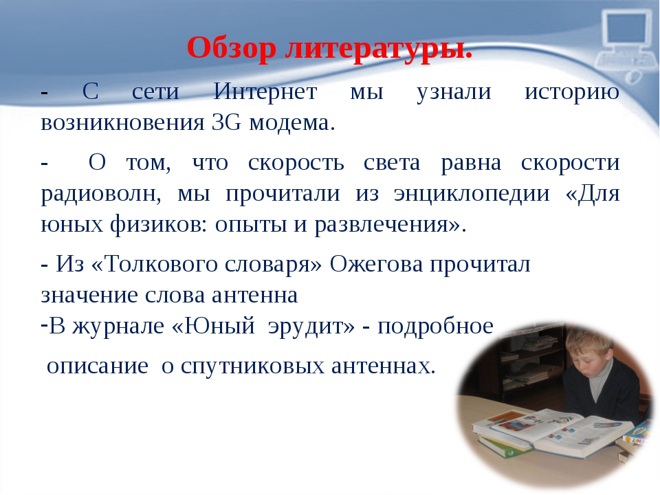 В литературном обзоре фактически приводится обоснование каждого информационного ресурса: на что опирался автор при его поиске и подборе, как использовал полученные данные, к чему они его «привели» и как помогли решить намеченные задачи, достичь цель.