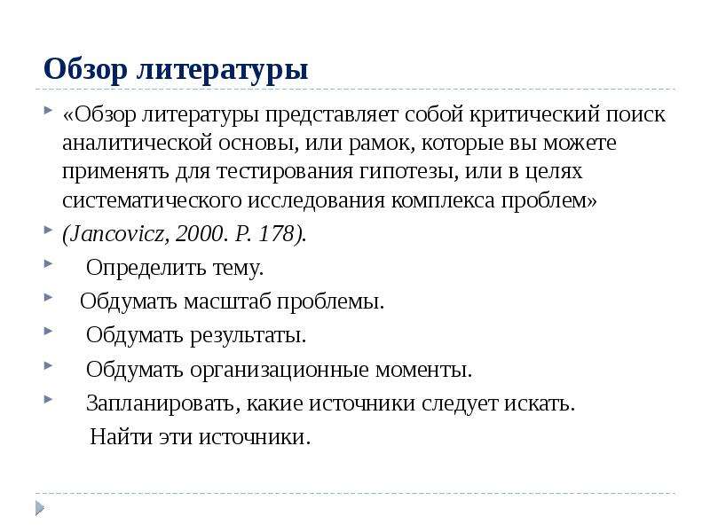 Просмотр литературы не является коллекционированием марок. Хороший обзор не просто обобщает литературу, но критически ее обсуждает, выявляет методологические проблемы и указывает на пробелы в исследованиях [19].Прочитав обзор литературы, читатель должен иметь приблизительное представление о: