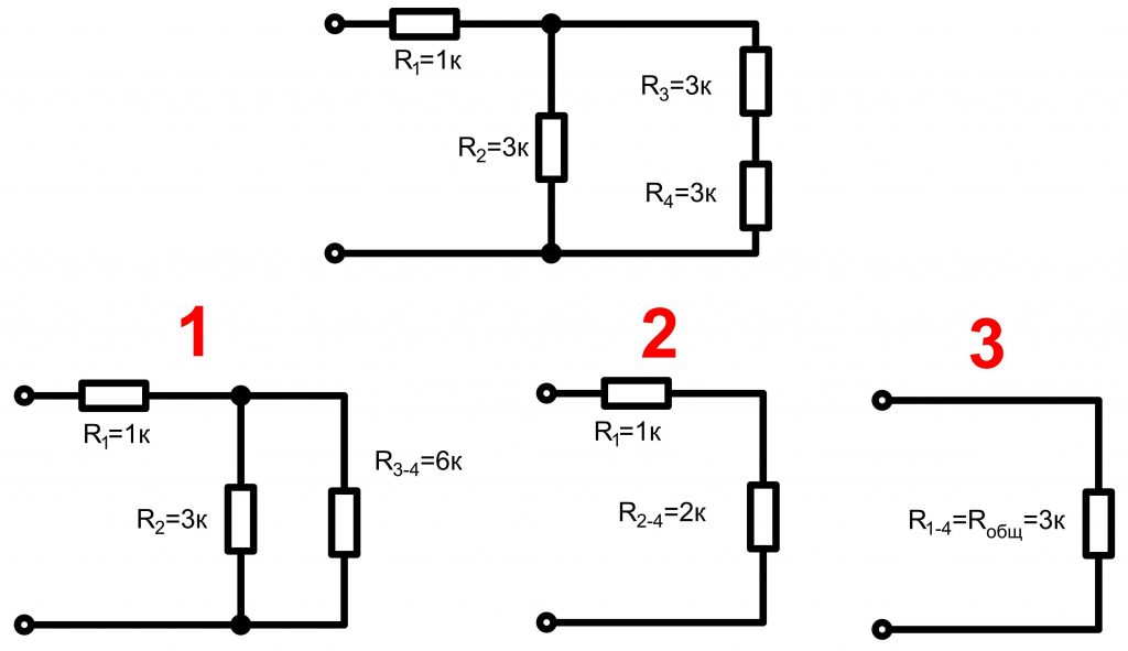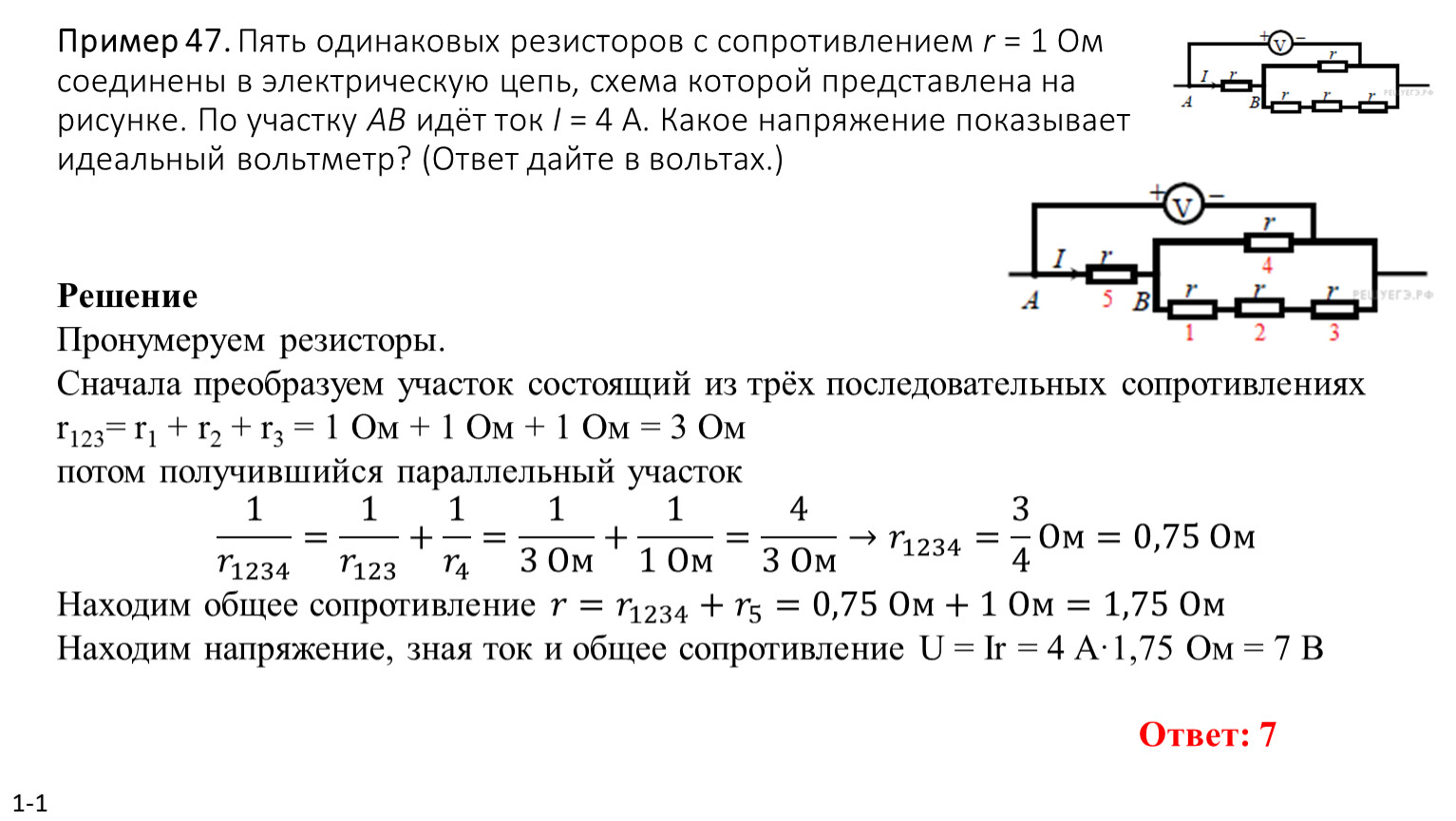 А далее, используя законы последовательного и параллельного соединения, ищем ответ на вопрос задачи с учётом того, что амперметр и вольтметр в нашей задаче — являются идеальными.