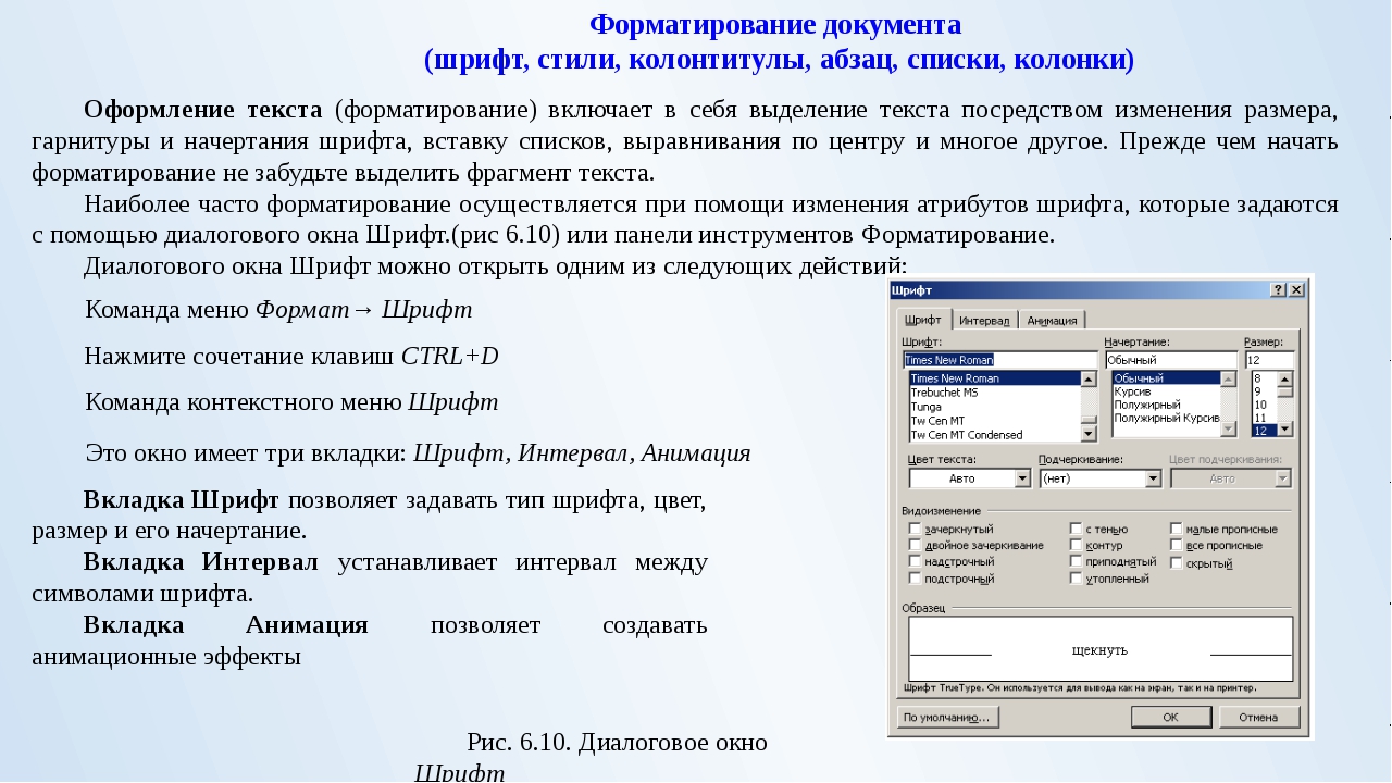 Текст документа – по ширине; левое поле – 20 – 30 мм; правое поле – 10 – 20 мм; шрифт Times New Roman Cyr размером № 12; с межстрочным интервалом – 1,2 – 1,5; интервал абзаца “после” – 6 пт.