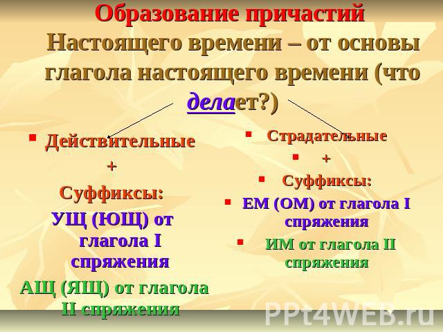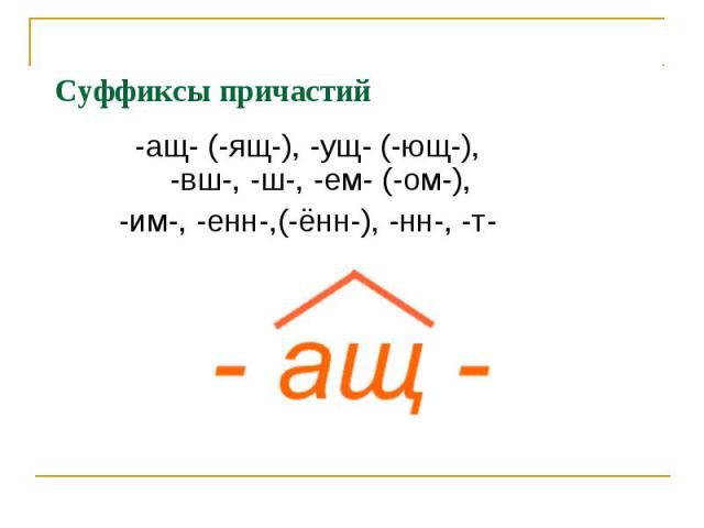 - I спряжение – страдательные причастия НВ образуются при помощи суффикса -ем- (-ом-). Примеры: обсуждать – обсуждают – обсуждаемый; покупать – покупают – покупаемый; решать – решают – решаемый.