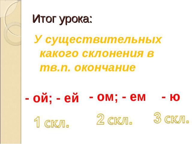 | 2 склонение | -ом (-ем) | Океаном, Тюленем, Стеклом, Полотенцем | Океанами, Тюленями, Стеклами, Полотенцами | |