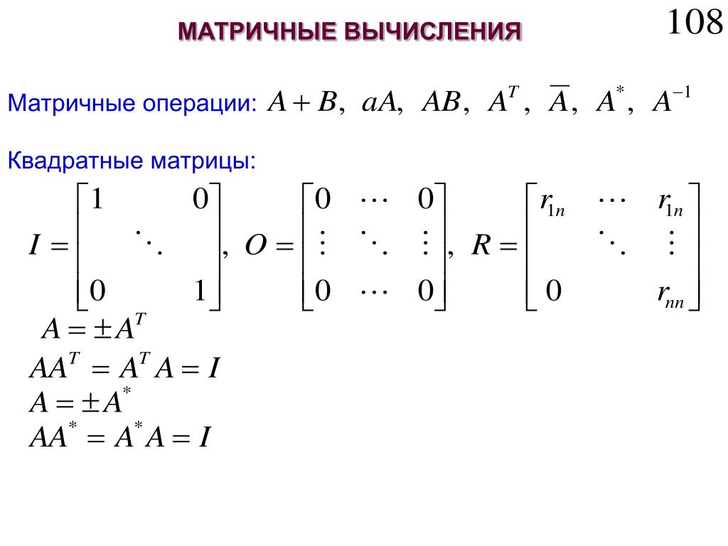 det(A) = 71 * 7.21128 * 4,98631 * -1,43242 = -3657; Ответ: det(A) = -3657 Операции с матрицами – выучить и понять это онлайн Как бы вы хотели узнать взаимодействие между организованным расположением чисел? Матрица (не фильм) будет обсуждаться далее, чтобы дать вам всестороннее представление о взаимодействии организованного расположения чисел. Что означают операции с матрицами?Операции с матрицами включают в себя все вычисления, выполняемые с матрицами. Это может варьироваться от сложения, умножения, вычитания, сочетания любых действий, транспонирования и т. д. Что такое матрица?Матрица — это просто набор прямоугольных или квадратных чисел, расположенных в строках и столбцах. Что такое элемент?Элемент — это отдельное число или переменная, расположенная в матрице. Например, в матрице 2 на 2; 2, 3, a и b — все элементы матрицы A. Кроме того, элементы матрицы расположены в массивах . Знание матриц используется при вычислении векторов и их операций, геометрии, а также линейных уравнений. Кроме того, матрица классифицируется по количеству строк и столбцов. Это в конечном итоге определяет его название. Чтобы лучше проиллюстрировать, матрица имеет три строки (т.е. 1, 2 ; 3, 4 ; 5, 6 ) и два столбца (то есть 1, 3, 5 ; 2, 4, 6 ), поэтому мы называем это матрицей 3 на 2 или 3 × 2 . Основные операции с матрицамиПервичные вычисления с матрицами считаются основными операциями с матрицами. Вскоре вы узнаете о них. Сложение матрицИнтересно знать, что две или более матриц можно суммировать, чтобы получить одну матрицу. Хотя для этого эти матрицы должны быть одного типа или размерности . Это означает, что, с одной стороны, матрица 2 на 2 добавляется только к матрице 2 на 2; и, с другой стороны, матрица 2 на 3 не может быть суммирована с матрицей 3 на 2. При сложении матриц одинаковой размерности суммируются только элементы, занимающие одинаковые позиции в своей матрице. Это означает, что для матрицы и другой матрицы Всегда следует помнить, что при сложении в матрицах сначала учитывается положение, а затем сумма элементов. Найти P + Q, если и Решение: Вычитание матриц Можно вычислить разницу между двумя или более матрицами. При вычитании матриц одинаковой размерности вычитаются только элементы, занимающие одинаковые позиции в своей матрице. Кроме того, разница между двумя матрицами будет включать вычитание второй матрицы из первой матрицы. Это означает, что для матрицы и другой матрицы Затем Вы всегда должны помнить, что разница матриц учитывает положение до того, как произойдет вычитание элементов. Найти P – Q если и Решение: Комбинированные или смешанные матричные операцииКомбинированные или смешанные матричные операции — это задачи, требующие применения более одной базовой матричной операции. Вычислить 2B – A для Решение: Операции над типами матриц Существует несколько видов операций, которые выполняются с матрицами. Умножение матрицы на скалярЭто также известно как умножение на константу . Здесь константа используется для умножения каждого элемента матрицы. Если 2 — константа, используемая для умножения матрицы, то Отрицательное значение матрицыИспользуя знание умножения матрицы на скаляр, можно получить отрицательную величину матрицы. Это просто делается путем умножения каждого элемента матрицы на -1. Обратите внимание, что знаки меняются в зависимости от того, каким знаком обладает тот или ин