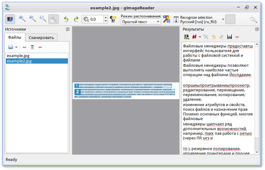 Ещё один сервис, который распознаёт неплохо простые документы с большими абзацами текста. Раздражает, что сначала нужно загрузить файл, выбрать для него язык, потом файл обработается сервером, нужно снова выбрать для него язык и запустить распознавание. Я как-то ожидал, что загружая я уже достаточно чётко выражаю намерение распознать файл.