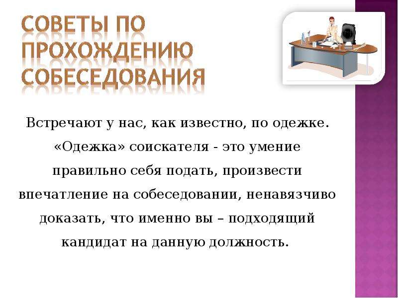 Работодателю будет приятен здоровый внешний вид кандидата. Отправляясь на встречу, избегайте слишком ароматного парфюма. - В одежде следует предпочесть классический стиль и «деловые» цвета — черный, серый, синий, коричневый.