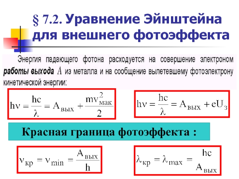Эту формулу принято называть уравнением Эйнштейна для внешнего фотоэффекта. С помощью уравнения Эйнштейна можно объяснить все закономерности внешнего фотоэффекта. Для красной границы фотоэффекта, согласно формуле Эйнштейна, можно получить выражение: