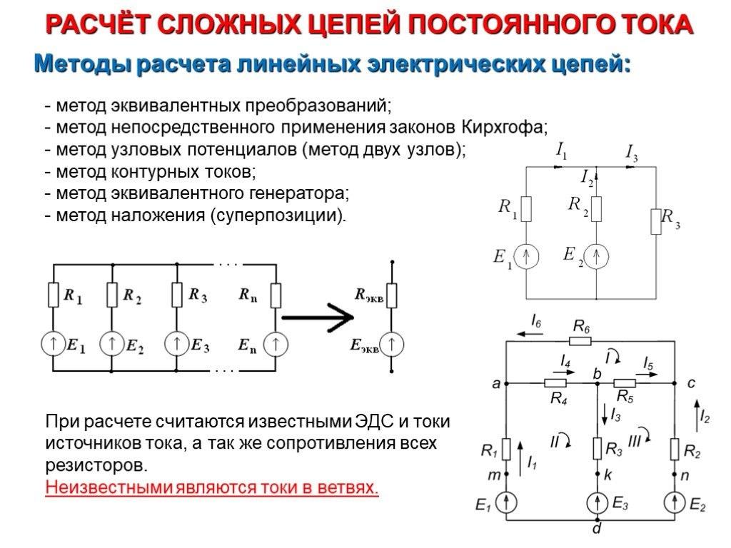 Расчет нелинейных электрических цепей постоянного тока производится на основе закона Кирхгофа. Методы расчета для линейных и нелинейных схем разные. Поэтому последние в рамках данной статьи не рассматриваются.