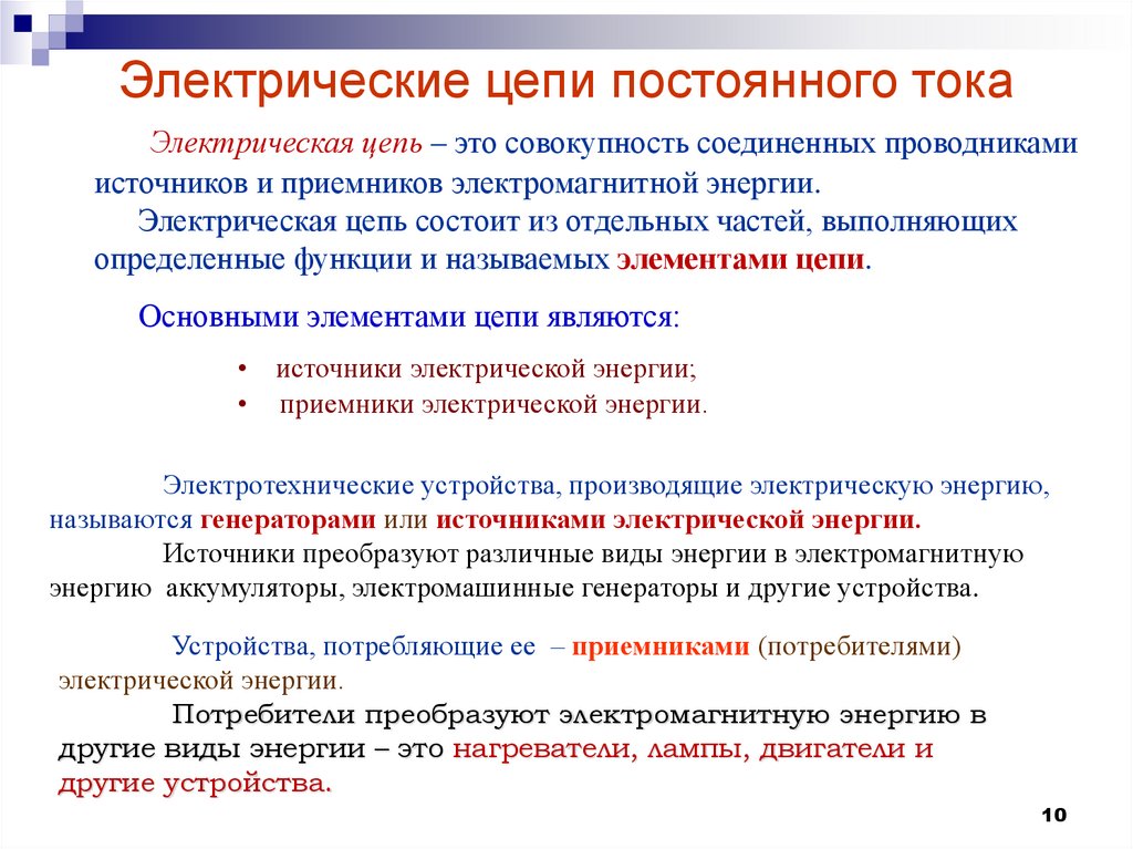 Электрические цепи постоянного тока, помимо этого, содержат источники напряжения и тока.