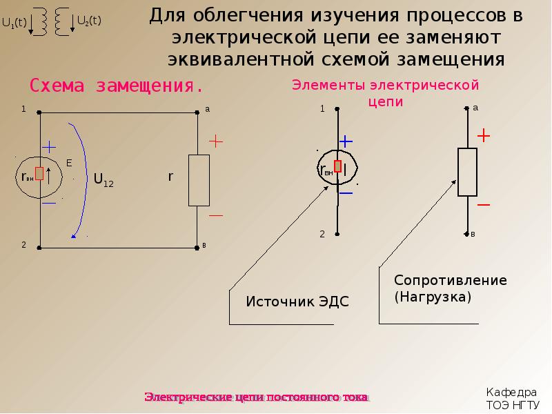 Чтобы произвести расчет и исследование электрической цепи постоянного тока (лабораторная работа для этих целей обычно служит), применяется схема замещения, то есть идеализированная цепь для расчета реальной. Чтобы ее получить, заменить нужно все элементы схемы. Физические процессы должны быть выражены в каждом математическом описании.