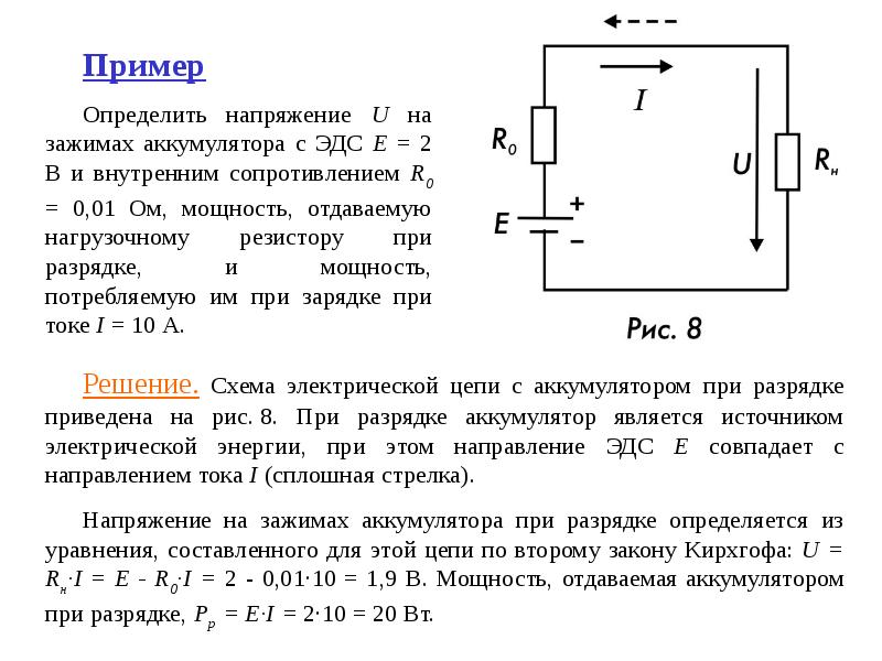 где I—’сила тока в цепи; U1 —напряжение на сопротивлении R1; U2 — напряжение на сопротивлении R2: U3, — падение напряжения на внутреннем сопротивлении источника тока Rвн.