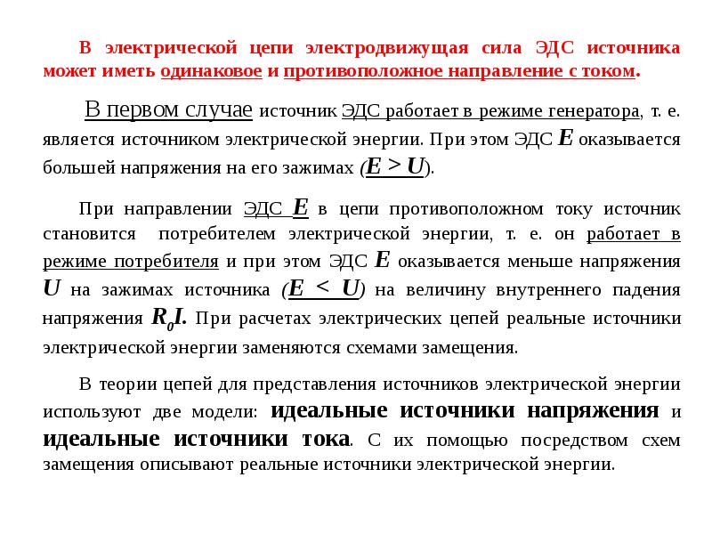 Независимое напряжение (ЭДС, ток) от сопротивления внешней цепи называют его источником. Источник ЭДС (напряжения) измеряется на холостом ходу, то есть, где ток в источнике равен нулю. В схемах замещения резистор учитывает тепловые энергетические потери, которые выделяются из источника. Если он равен нулю, а источник тока — бесконечности, это — идеальный источник. Реальный всегда имеет конечное значение.