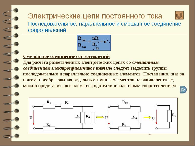 При анализе таких цепей часто применяют принцип упрощения, состоящий в замене сложных участков электрической цепи на простые. Но ток и напряжение меняться не должны. Тогда цепь свернется до самого простого вида. Соединенные резистивные элементы должны быть параллельно и последовательно преобразованы.