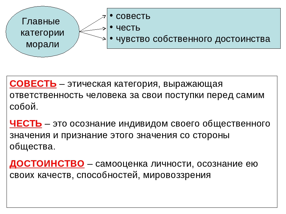 Совесть – характеризующая способность человека осуществлять внутреннюю самооценку с позиций соответствия своего поведения требованиям нравственности.