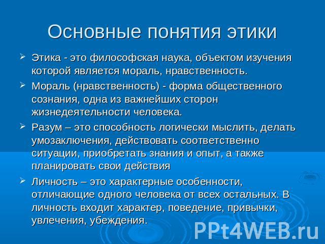 Категории этики – это основные понятия этической науки, отражающие наиболее существенные элементы морали. К ним относят: