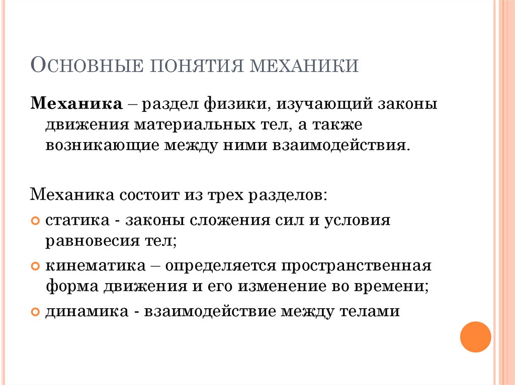 Кинематика – раздел механики, в котором изучается механическое движение без рассмотрения его причин. Кинематика дает ответ на вопрос, где будет тело в пространстве с течением времени, если известны его первоначальные характеристики.