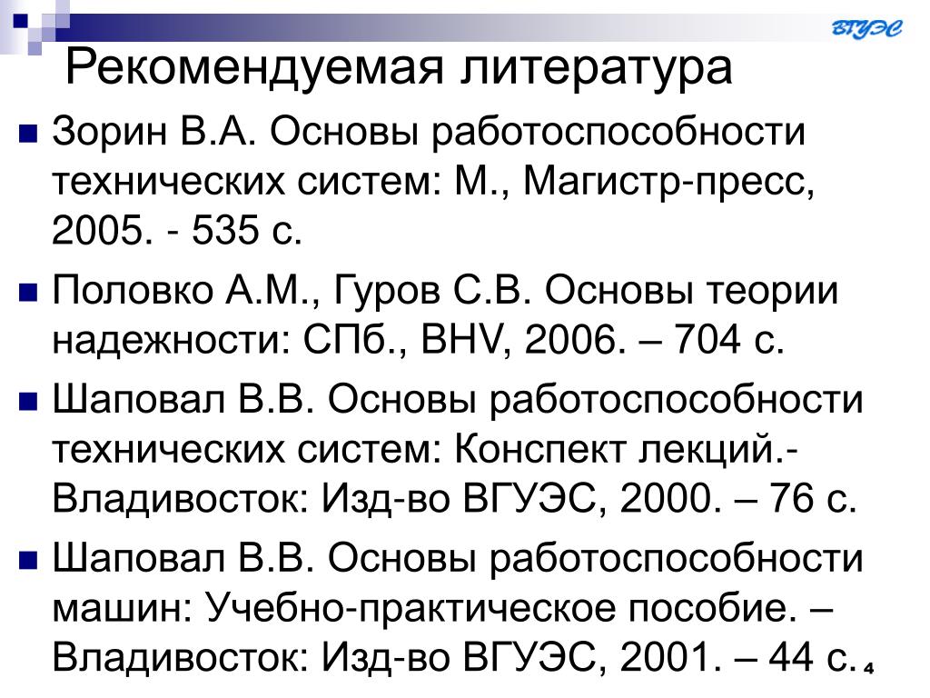 Зорин В. А. З-862 Основы работоспособности технических систем : учеб-. ник для студ. высш. учеб. заведений / В. А. Зорин. — М. : Издательский центр «Академия», 2009. — 208 с. ISBN 978-5-7695-6003-3. Рассмотрены основные процессы, вызывающие снижение работоспо-собности технических систем (машин): трение, изнашивание, пластичес-кое деформирование, усталостное и коррозионное разрушение деталей машин. Приведены основные направления и методы обеспечения рабо-тоспособности машин.