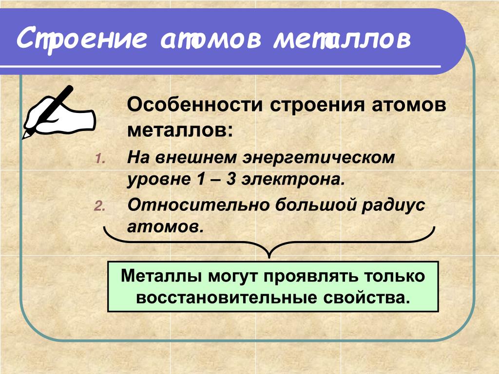 Электроны в металлических атомах расположены намного дальше от ядра, чем электроны неметаллов. Этим объясняется лёгкость отделения валентных электронов, поэтому металлы всегда являются восстановителями в химических реакциях.