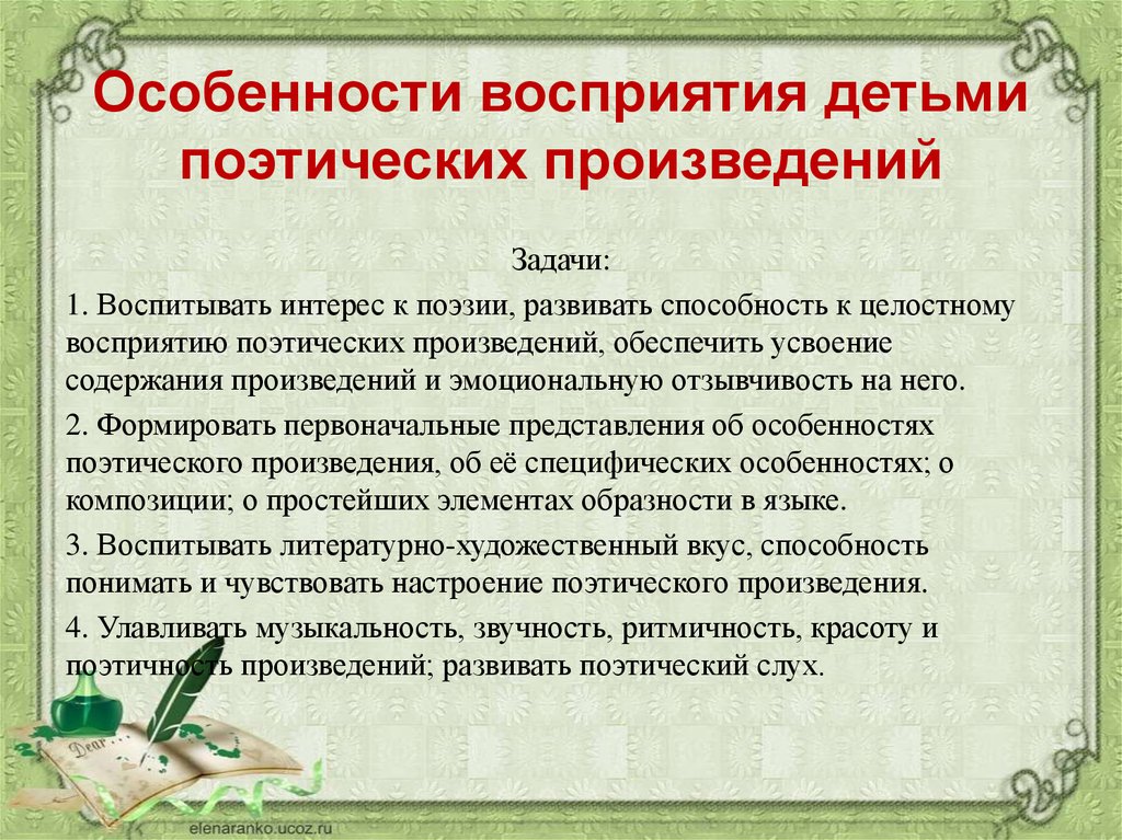 Особенности восприятия содержания и формы поэтических произведений детьми дошкольного возраста.