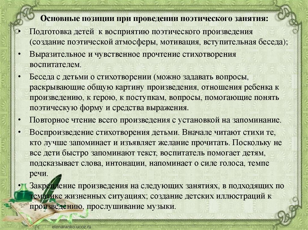 В стихотворении рассматривают две стороны: содержание художественного образа и поэтическую форму (музыкальность, ритмичность). Необходимо научить ребенка понимать и воспринимать эти две стороны в их единстве.