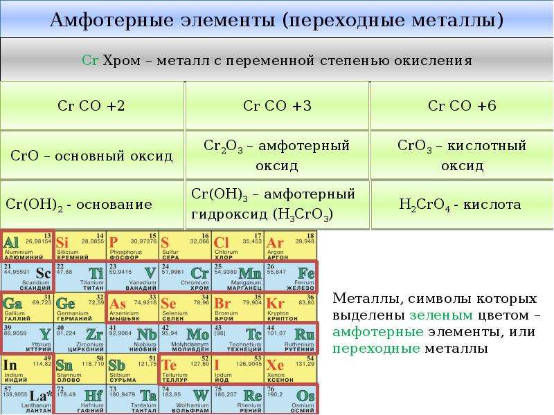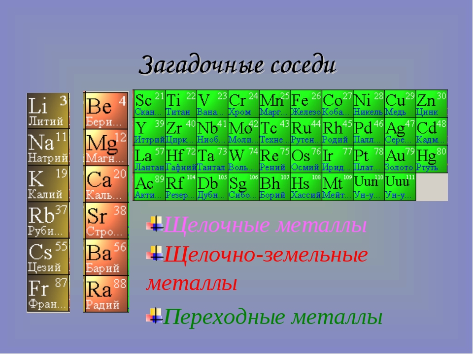 Переходные элементы | Encyclopedia. comПереходные элементы — это элементы, составляющие группы с 3 по 12 периодической таблицы.Эти элементы, все из которых являются металлами, включают в себя некоторые из самых известных названий в периодической таблице — среди них железо, золото, серебро, медь, ртуть, цинк, никель, хром и платина. Ряд других переходных элементов, вероятно, несколько менее известен, хотя они имеют важное промышленное применение. Эти элементы включают титан, ванадий, марганец, цирконий, молибден, палладий и вольфрам. Особого упоминания заслуживает один член переходной семьи. Технеций (элемент № 43) — один из двух «легких» элементов, не встречающихся в природе.Первоначально он был получен синтетическим путем в 1937 году среди продуктов циклотронной реакции. Первооткрывателями технеция были итальянские физики Карло Перрье и Эмилио Сегре (1905–1989). Переходные элементы имеют много общих физических свойств. За заметным исключением ртути, единственного жидкого металла, все они имеют относительно высокие температуры плавления и кипения. Кроме того, переходные металлы имеют некоторые общие химические свойства.Например, они имеют тенденцию образовывать комплексы, соединения, в которых группа атомов группируется вокруг одного атома металла. Обычный сульфат меди, например, обычно встречается в конфигурации, включающей четыре молекулы воды, окружающие один ион меди. Комплексы переходных элементов имеют множество применений в медицине и промышленности. Еще одним общим свойством переходных элементов является их склонность к образованию окрашенных соединений. Некоторые из самых ярких и красивых известных химических соединений включают в себя переходные металлы.Соединения меди имеют тенденцию быть синими или зелеными; соединения хрома имеют желтый, оранжевый или зеленый цвет; соединения никеля имеют синий, зеленый или желтый цвет; а соединения марганца имеют пурпурный, черный или зеленый цвет. Полезные словаАмальгама: Сплав, содержащий ртуть. Основной кислородный процесс (BOP): Метод производства стали, при котором смесь чугуна, железного лома и стального лома плавится в большом стальном контейнере, и через контейнер продувается струя чистого кислорода. Преобразователь Бессемера: Устройство для преобразования чугуна в сталь, в котором поток горячего воздуха продувается через расплавленный чугун. Доменная печь: Сооружение, в котором металлическая руда (часто железная руда) восстанавливается до элементарного состояния. Чугун: Термин, используемый для описания различных форм железа, которые также содержат от 0,5 до 4,2 процента углерода и от 0,2 до 3,5 процента кремния. Комплекс: Химическое соединение, в котором один атом металла окружен двумя или более группами атомов. Ковкий: Способен вытягиваться или растягиваться в тонкую проволоку. Электролитическая ячейка: Система, в которой электрическая энергия используется для осуществления химических превращений. Электролитическая медь: Очень чистая форма меди. Ковкий: Можно раскатывать или штамповать в тонкие листы. Мартеновский процесс: Способ производства стали, при котором поток горячего воздуха или кислорода обдувают поверхность расплавленной смеси чугуна, гематита, железного лома и известняка в большом кирпичном контейнере. Патина: Антикоррозийная пленка, часто образующ