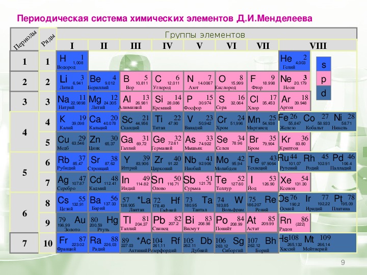 - химические элементы на основе их положения в периодической системе Д.И.Менделеева и особенностей строения их атомов;