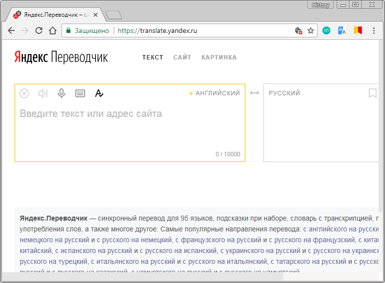 Полный спектр возможностей «Яндекс. Переводчика» раскрывается пользователям браузера Yandex. Это главная альтернатива в русскоязычном сегменте. Сервис предлагает синхронный перевод со 100 языков, подсказки при наборе, словарь с транскрипцией, произношением и примерами употребления слов.