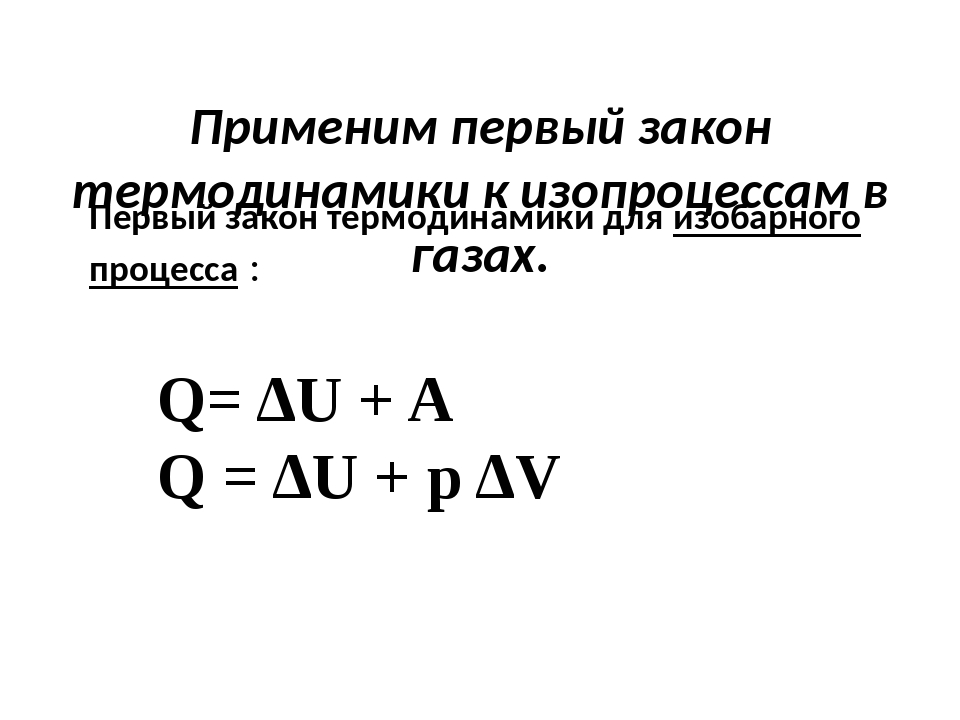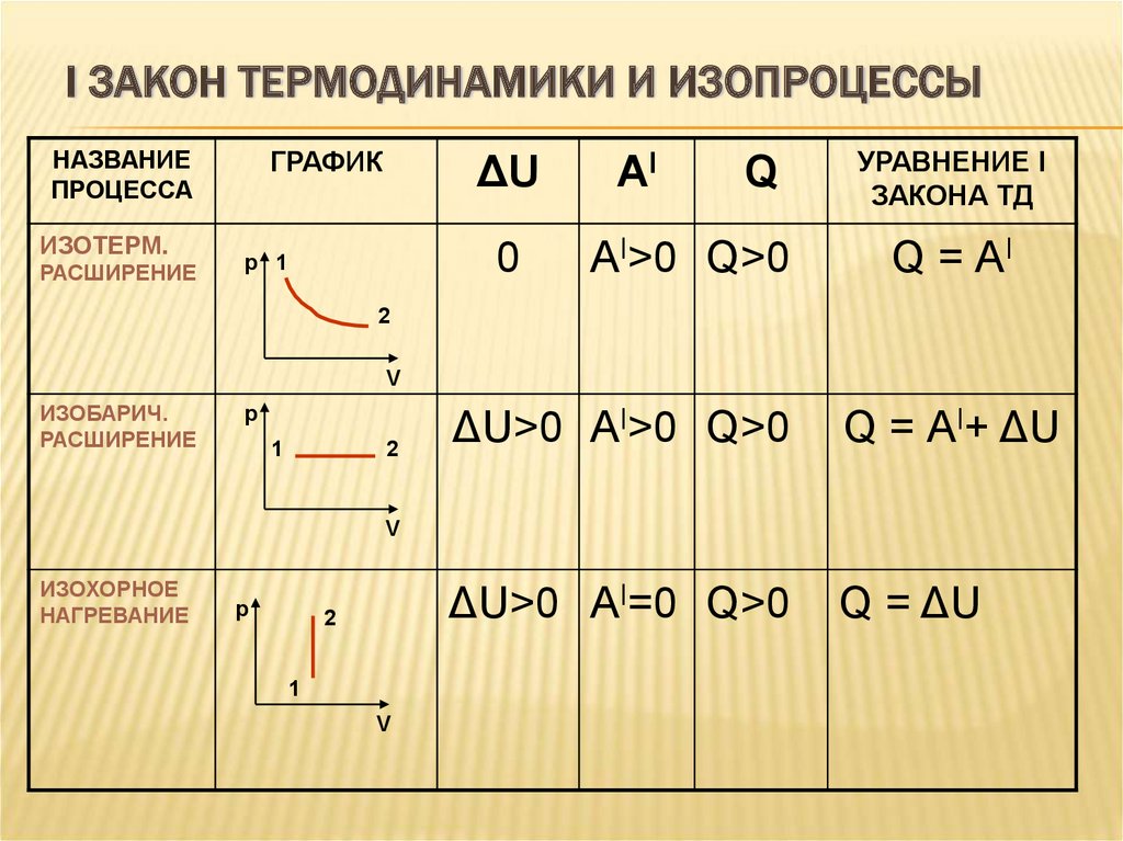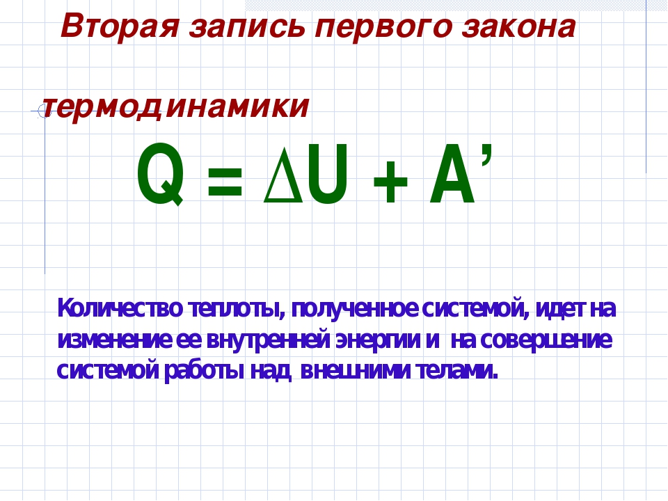 2 | Q= ΔU+ A’ | Количество теплоты, переданное системе, идет на изменение его внутренней энергии и на совершение им механической работы |