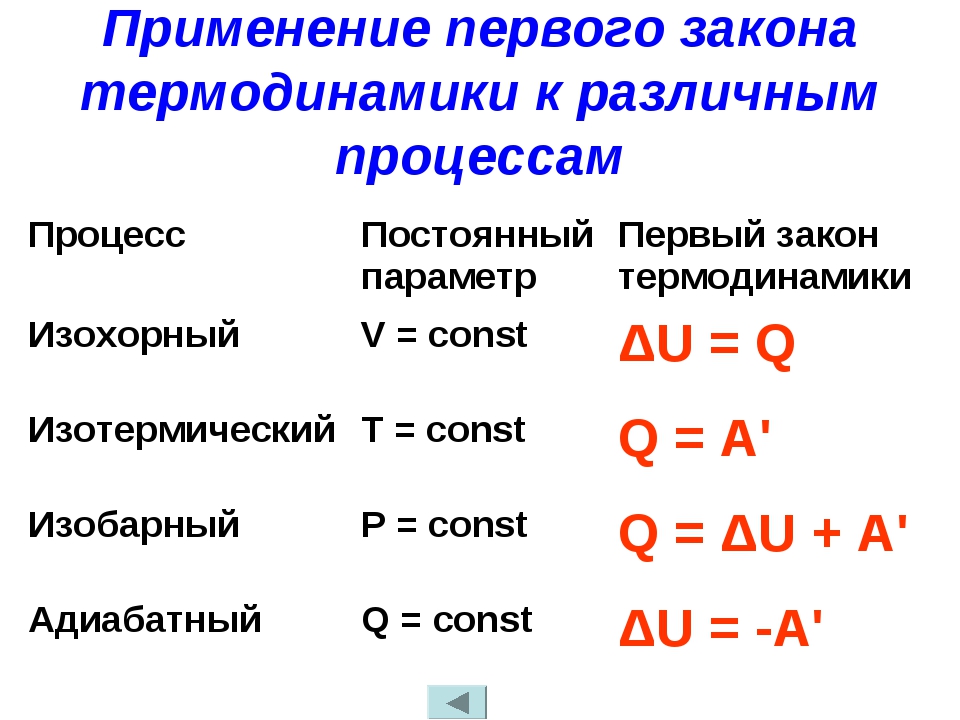4 | ΔU= Q+ A’ | Изменение внутренней энергии тела при переходе из одного состояния в другое равно сумме количества теплоты, переданного телу и работе внешних сил |