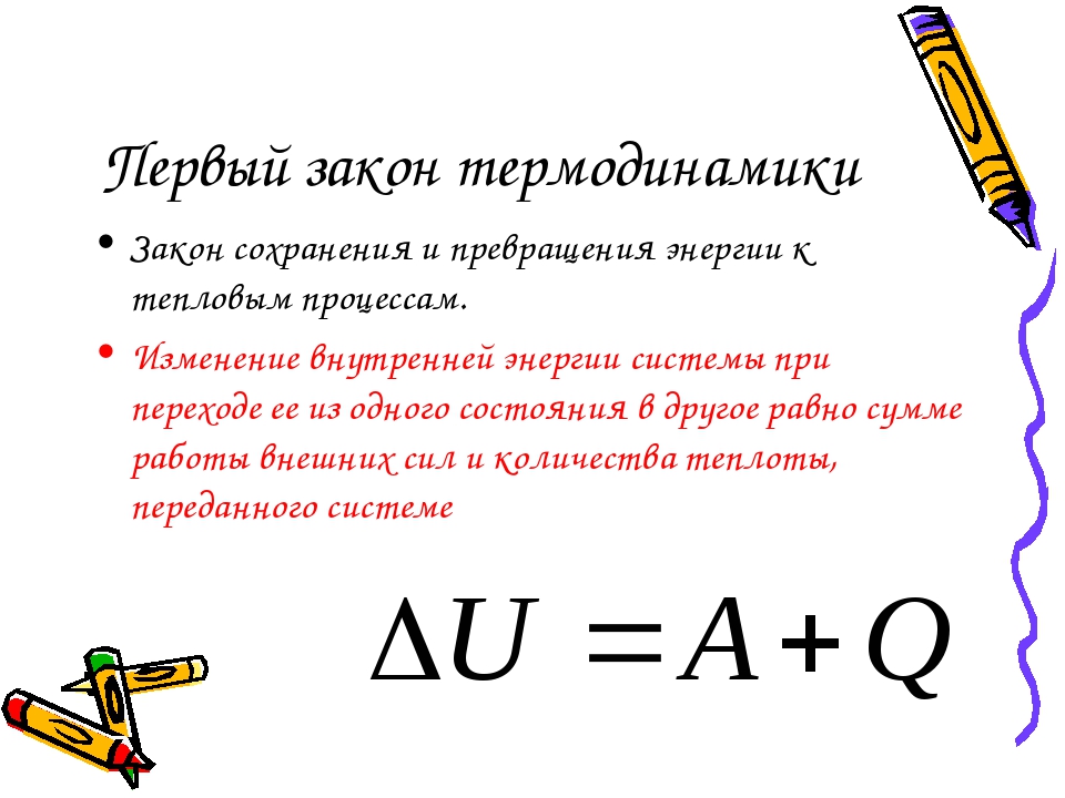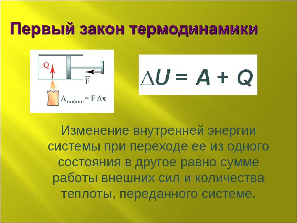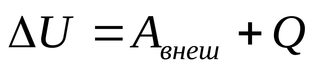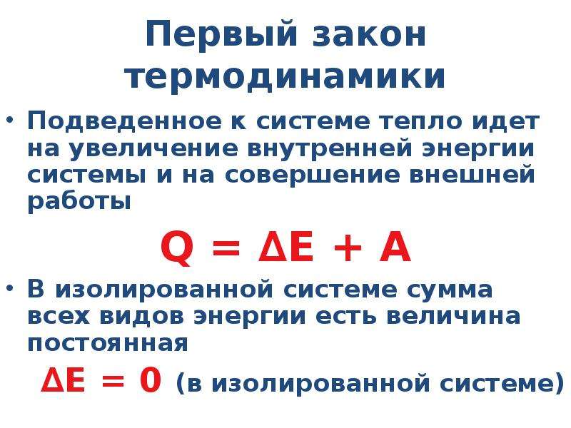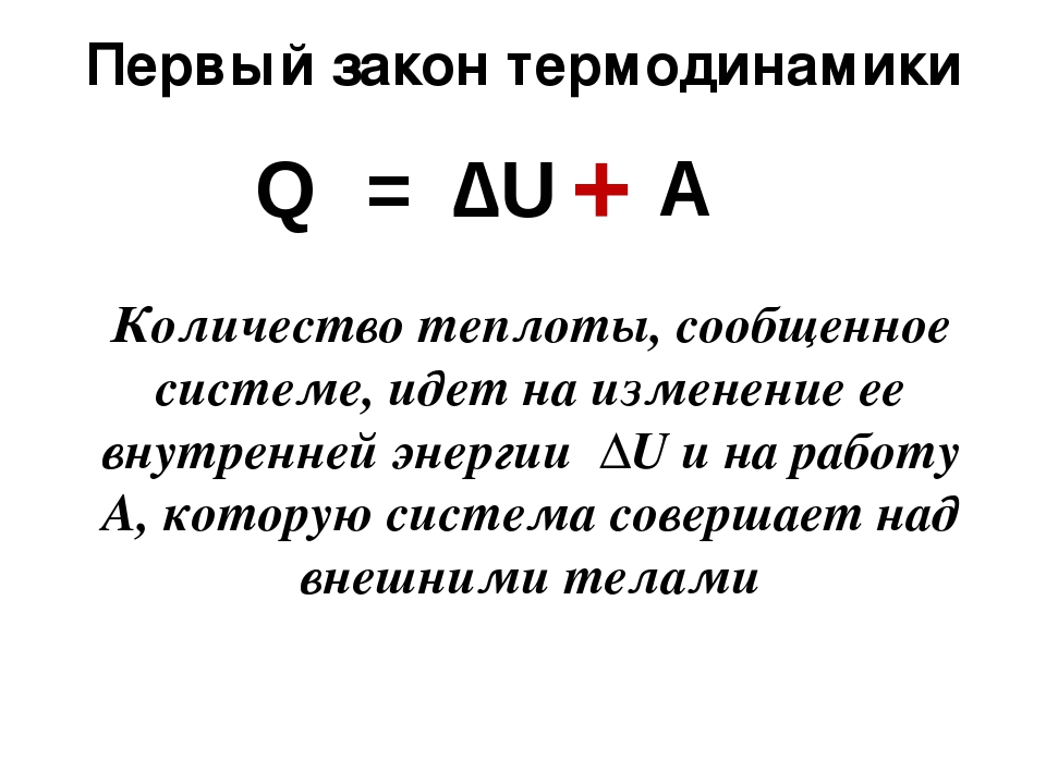 Первый закон (начало) термодинамики, или закон сохранения энергии в тепловых процессах: количество теплоты, сообщённое системе, расходуется на совершение работы системы против внешних сил и на увеличение её внутренней энергии: Q = ΔU + A, где Q — количество теплоты, полученное системой; ΔU — изменение внутренней энергии системы; A — работа, совершённая системой.