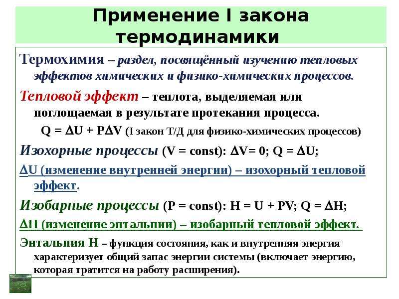 Первый закон термодинамики является законом сохранения энергии в применении к процессам, которые сопровождаются выделением, поглощением или преобразованием теплоты в работу. В химической термодинамике действие 1-го закона распространяется на ту универсальную форму энергии, которая называется внутренней энергией. [c.73]