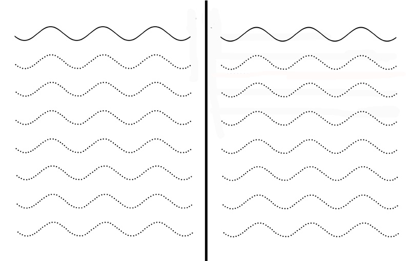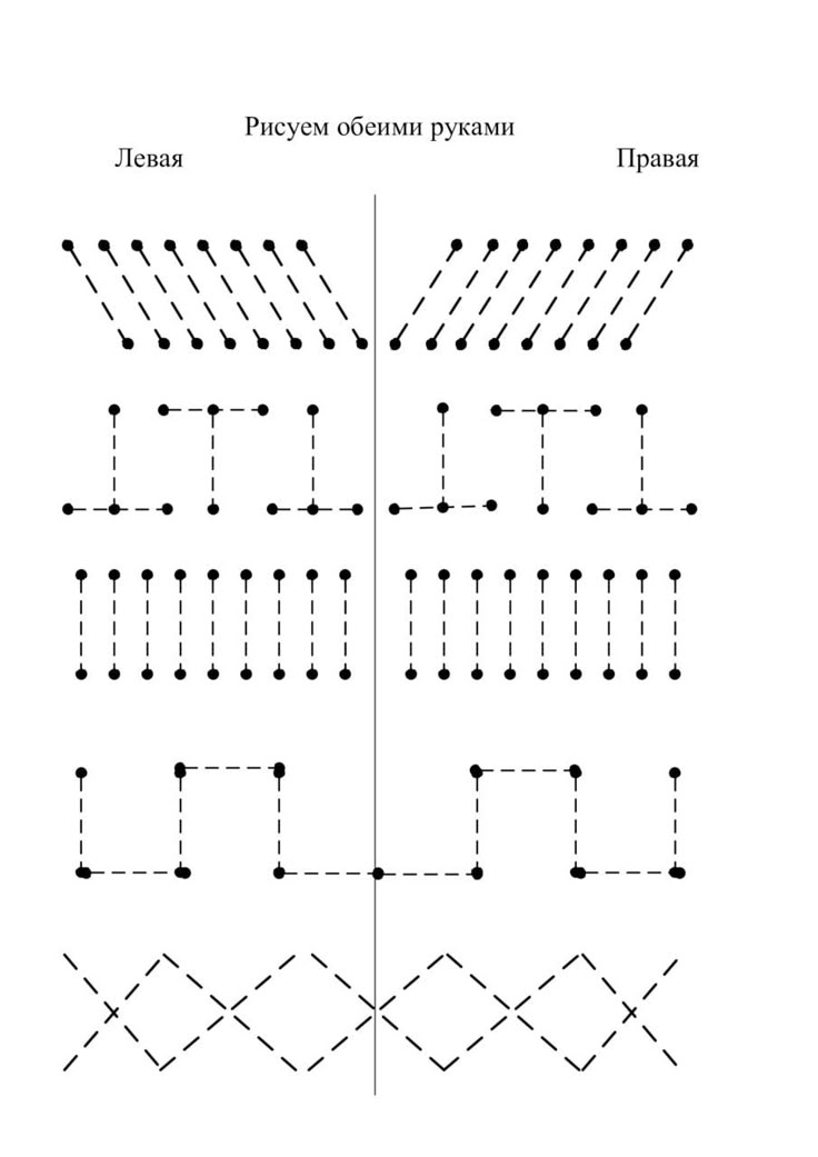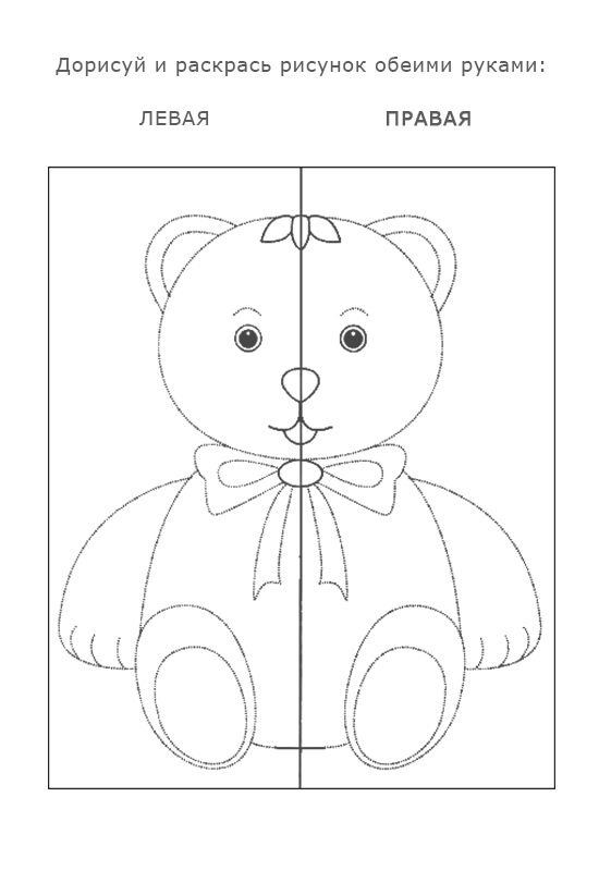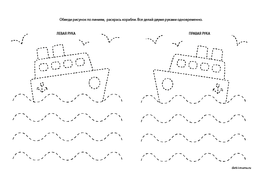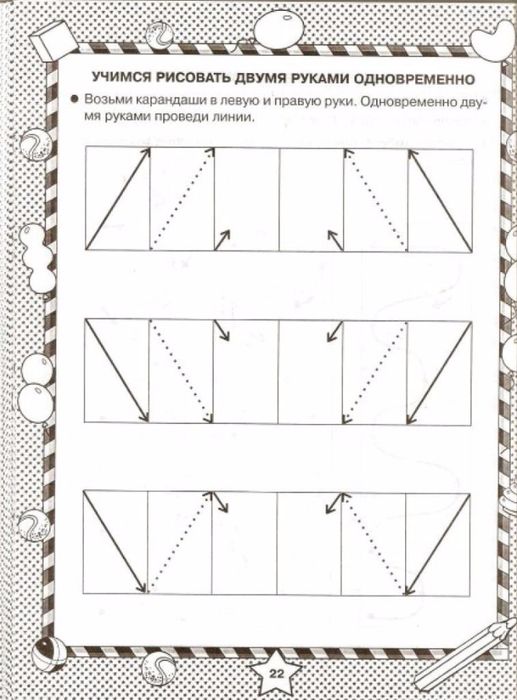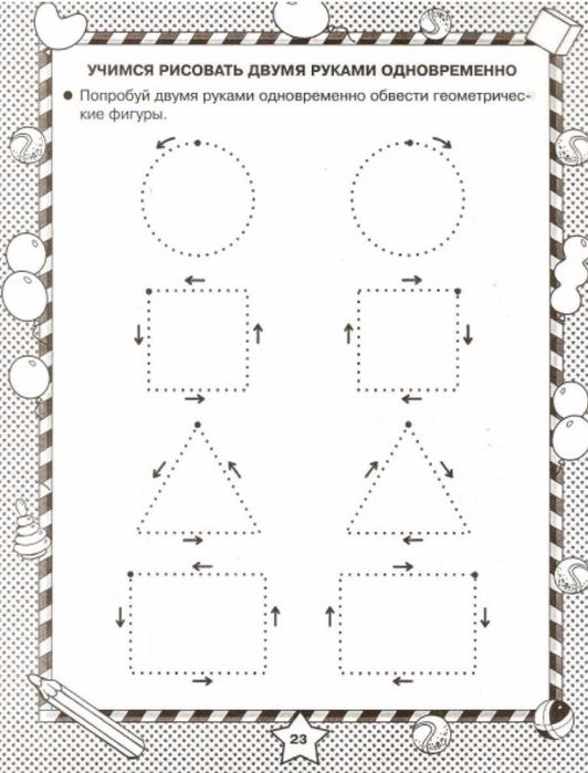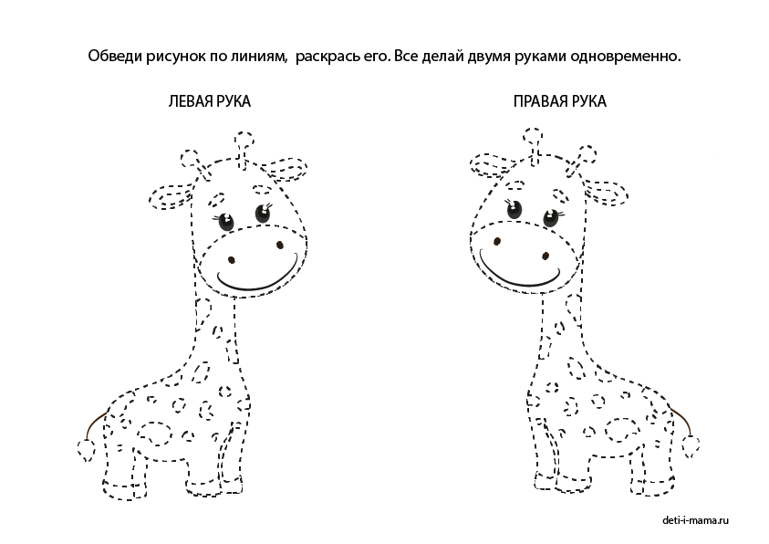 В этом задании на амбидекстрию нужно следовать по контуру, держа фломастеры в обеих руках одновременно. Предложите ребёнку потренироваться на шаблоне, а потом нарисуйте свои варианты. Не забудьте прикрепить лист скотчем к столу 😉