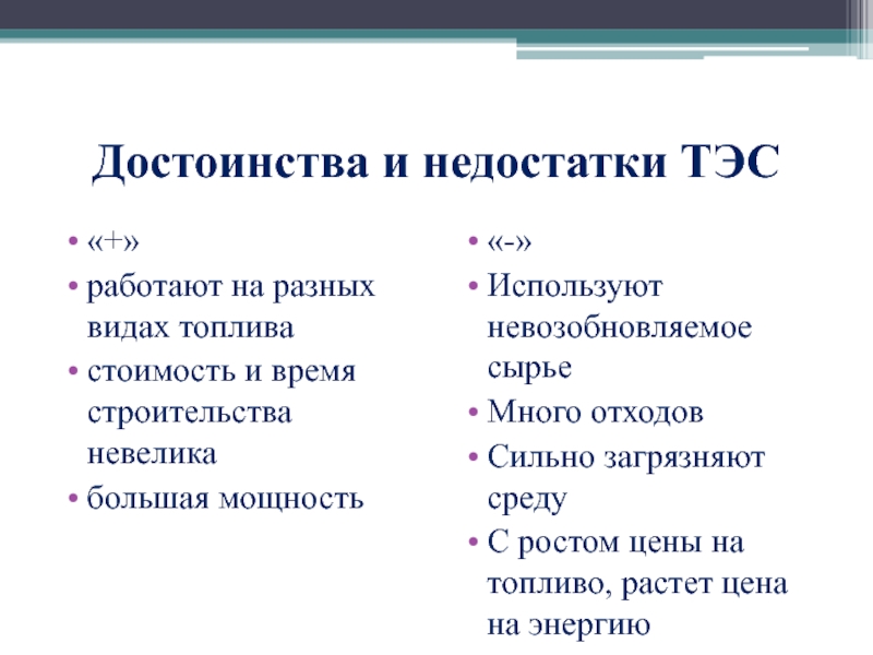 Экономико-географические достоинства (+) и недостатки (-) основных видов электростанций: