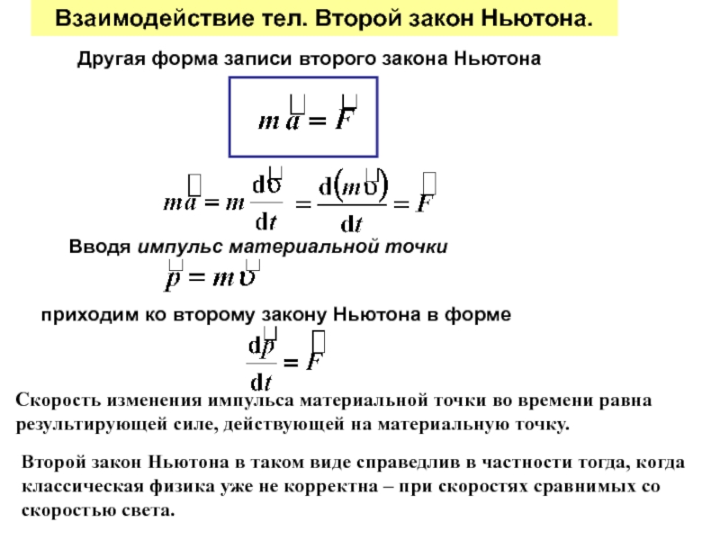 Второй закон динамики Ньютона ускорение, приобретаемое телом, пропорционально действующей на него силе и обратно пропорционально массе тела. Первая производная от импульса математической точки по времени равна действующей на нее силе [c.