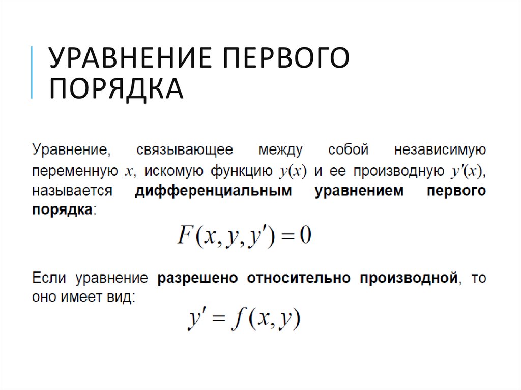 Если неизвестная функция содержит две или большее число переменных, то дифференциальное уравнение называется уравнением в частных производных. Порядком дифференциального уравнения называется максимальный порядок входящей в него производной неизвестной функции.