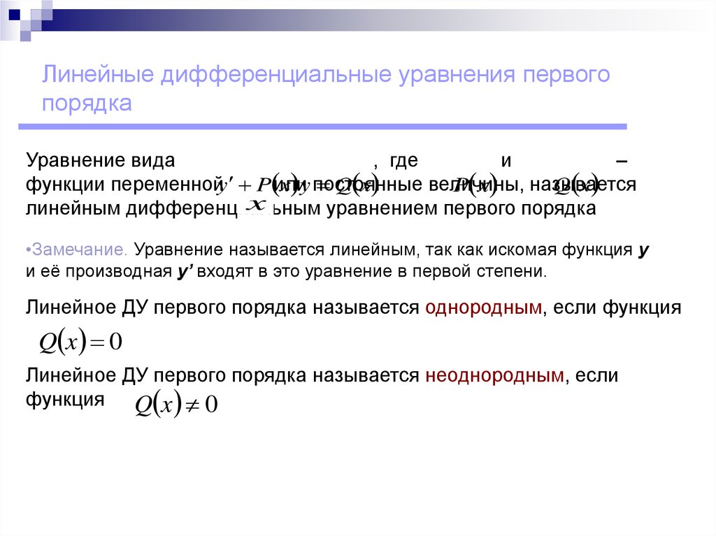 dy / dx + P (x) y = Q (x), где P (x) и Q (x) – функции от x.