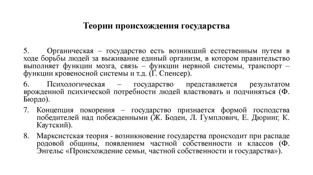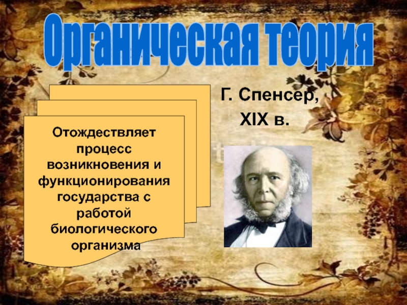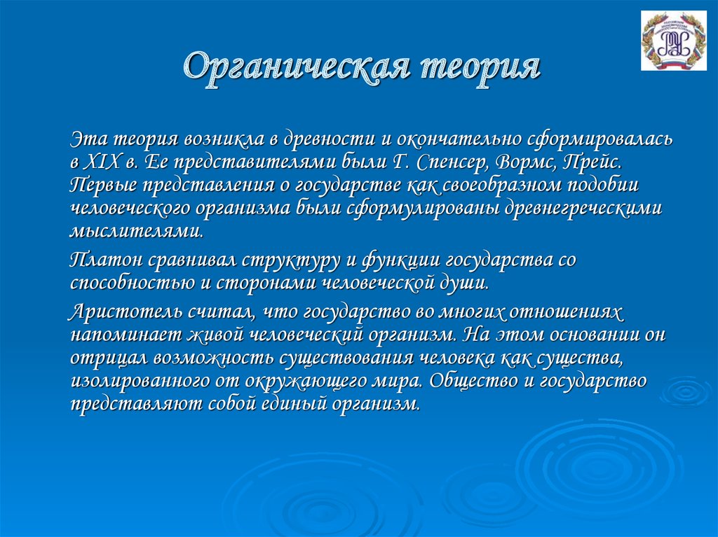 Органическая теория имеет много талантливых приверженцев. Наиболее выдающимися ее представителями явились социолог Спенсер, экономист Шеффле, юрист Блюнчли. В настоящее время наиболее видными сторонниками органической теории нужно признать в Германии проф. Прейса, а во Франции – небезызвестного социолога Рене Вормса.