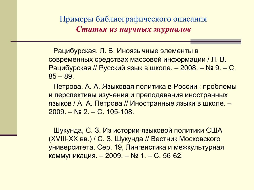 Обязательна транслитерация всех указанных источников (обозначается как References). Порядок библиографических записей в References точно соответствует русскоязычному списку.