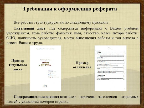 РефератШкольникам и студентам за весь период обучения приходится выполнять очень много работ, в том числе, докладов, рефератов, курсовых проектов. Правильное оформление своего труда – это залог успеха и повод предстать перед преподавателем в лучшем виде, ведь встречают реферат именно по первому листу.