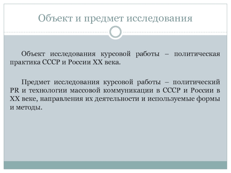 Предмет – это четко обозначенные тематические рамки исследования (предмет почти всегда дословно повторяет название работы, включая территориальные, хронологические и проблемные рамки).