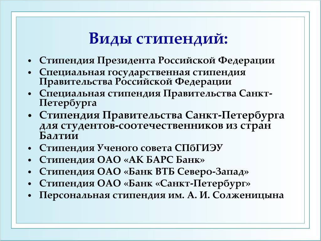 Каждый месяц, 24 числа, для студентов бюджетного отделения наступает небольшой праздник – приходит стипендия. Однако все не так просто, ведь ее размер зависит от многих факторов: среднего балла, наличия льгот, успеваемости и др. Поэтому для начала познакомим вас с видами стипендий.