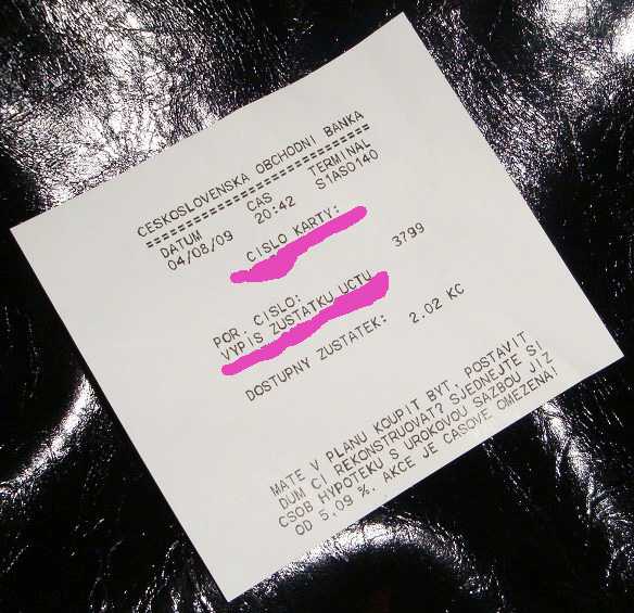 Как правило, получить чек можно без снятия наличных. Если в банкомате такая функция не предусмотрена, то достаточно снять небольшую сумму (скажем 100 крон) и нажать на кнопку «распечатать подтверждение о транзакции». Помимо чека в полицию необходимо принести и саму карточку. Сотрудник ведомства сделает копию ее лицевой стороны и вернет владельцу.