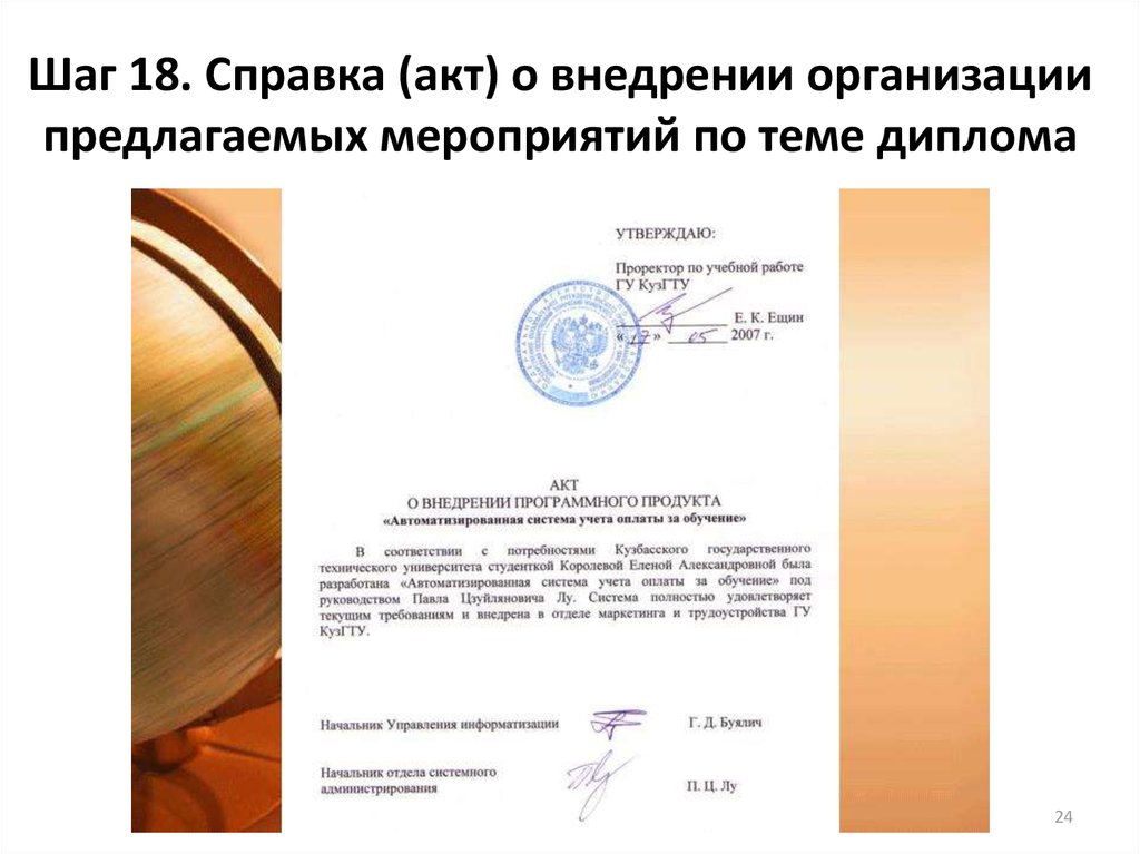 Несмотря на то что акт не нужен большинству студентов, подготовить его не так уж и сложно. Можно проявить инициативу и предупредительность и сделать его заранее, приятно удивив комиссию и избавившись от возможных дополнительных вопросов.Кем выдается акт внедрения результатов дипломной работы