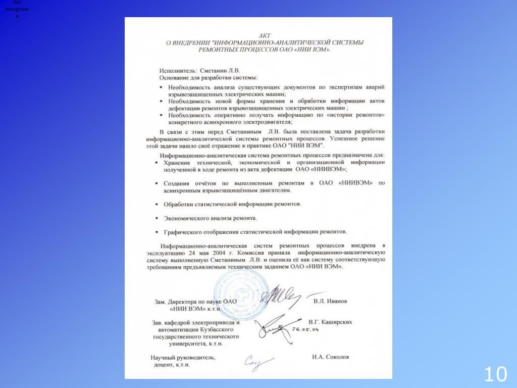 Рекомендовано прилагать к научным работам акт внедрения на бланке предприятия, на территории которого применялись полученные исследовательские результаты диссертации.